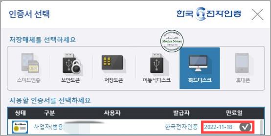 (6) 다시 인증서 선택 화면에서 동일하게 선택 후 인증서 비밀번호를 입력합니다.