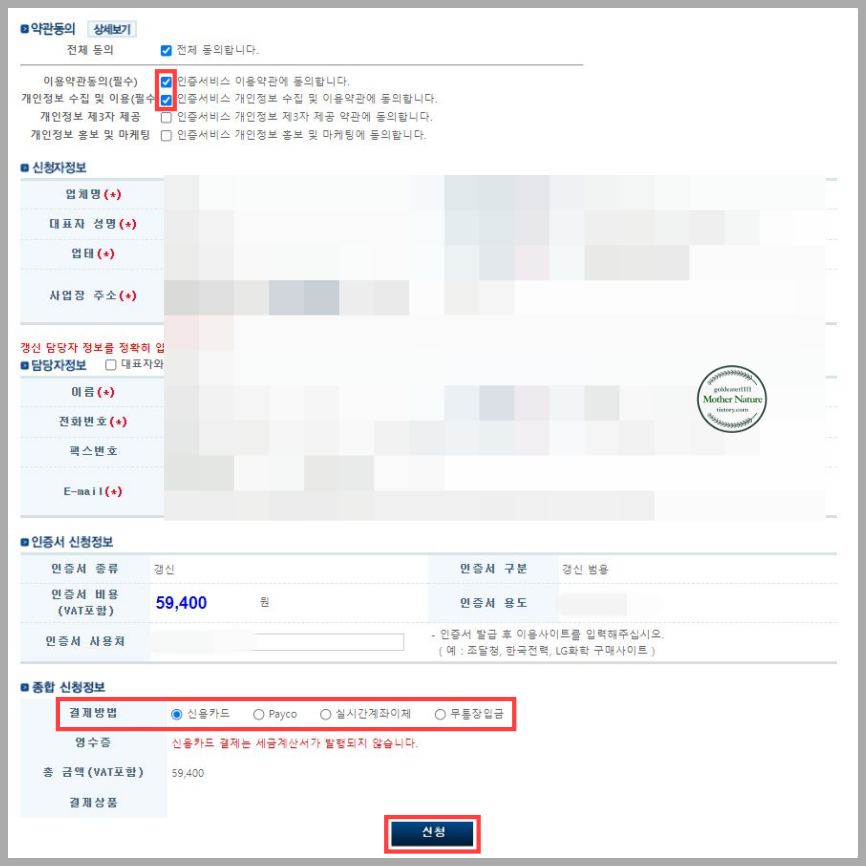 (5) 필수 약관에만 동의를 하고 신청자정보와 담당자정보에 변동이 없는지 확인합니다.