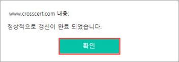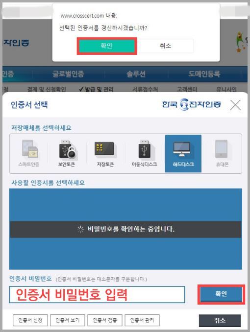 '선택된 인증서를 갱신하시겠습니까?'라는 메시지가 나오면 확인을 누릅니다.
