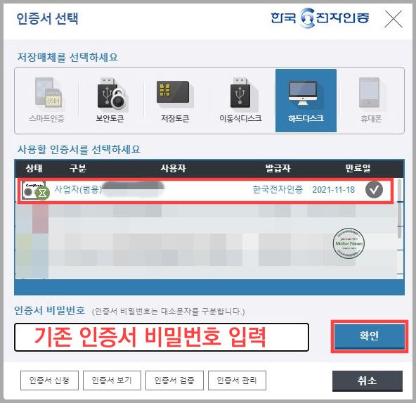 (4) 인증서 선택 창이 나오면 갱신할 인증서를 선택하고 기존에 사용하던 인증서 비밀번호를 입력 후 확인을 누릅니다.