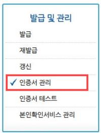 위의 (3) 메뉴 화면에서 발급 및 관리의 네번째에 있는 인증서 관리로 들어갑니다.