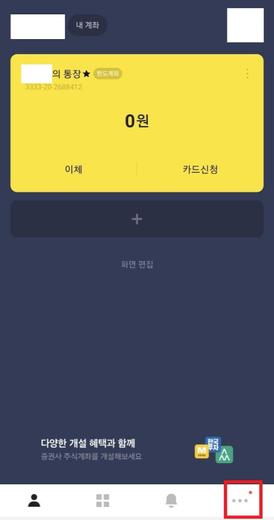 - 메인화면의 우측 하단에 있는 가로점 세 개의 메뉴로 들어갑니다.